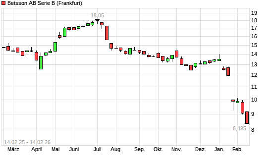 Mit dem Rücksetzer auf 8,44 EUR hat die Betsson-Aktie (ISIN SE0022726485) am 13.02.2026 ein neues 12-Monats-Tief erreicht und damit den Kurs vom 11.02.2026 eingestellt.