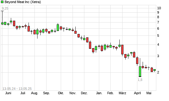 Mit dem Rücksetzer auf 2,08 EUR hat die Beyond Meat-Aktie (ISIN US08862E1091) am 12.05.2025 ein neues All-Time-Low erreicht und damit den Kurs vom 09.05.2025 eingestellt.