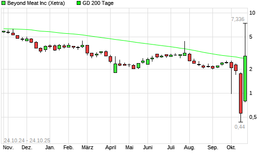 Mit dem Rücksetzer auf 2,41 EUR hat die Beyond Meat-Aktie am 23.10.2025 die 200-Tage-Linie nach unten gekreuzt.