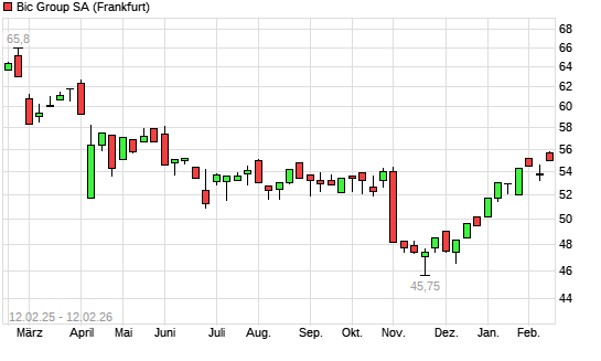 Mit dem Anstieg auf 55,80 EUR hat die Bic-Aktie (ISIN FR0000120966) am 11.02.2026 ein neues 6-Monats-Hoch erreicht und damit den Kurs vom 09.02.2026 eingestellt.