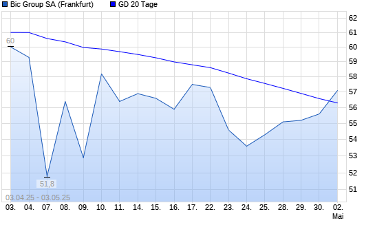 Mit dem Anstieg auf 57,10 EUR hat die Bic-Aktie am 02.05.2025 die 20-Tage-Linie nach oben gekreuzt.