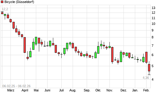 Mit dem Rücksetzer auf 4,64 EUR hat die Bicycle-Aktie (ISIN US0887861088) am 05.02.2026 ein neues All-Time-Low erreicht und damit den Kurs vom 04.02.2026 eingestellt.