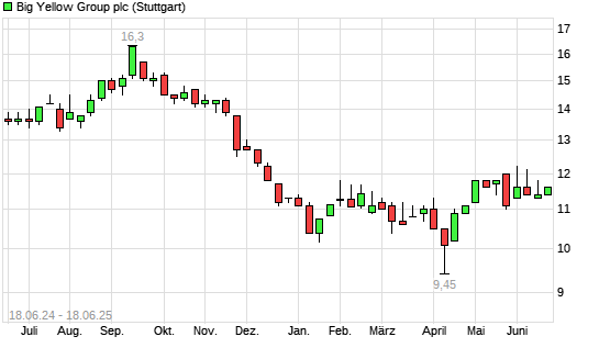 Mit dem Anstieg auf 12,00 EUR hat die Big Yellow Group-Aktie (ISIN GB0002869419) am 17.06.2025 ein neues 6-Monats-Hoch erreicht und damit den Kurs vom 09.05.2025 eingestellt.