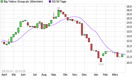 Mit dem Rücksetzer auf 10,90 EUR hat die Big Yellow Group-Aktie am 24.03.2025 die 50-Tage-Linie nach unten gekreuzt.