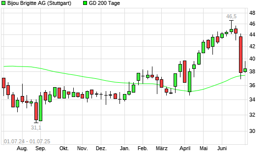 Mit dem Anstieg auf 39,10 EUR hat die Bijou Brigitte-Aktie am 30.06.2025 die 200-Tage-Linie nach oben gekreuzt.