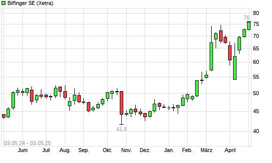 Mit dem Anstieg auf 76,25 EUR hat die Bilfinger-Aktie (ISIN DE0005909006) am 02.05.2025 ein neues 10-Jahres-Hoch erreicht und damit den Kurs vom 01.05.2025 eingestellt.