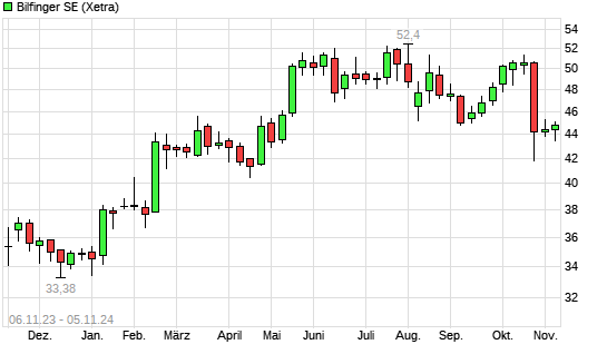 Mit dem Rücksetzer auf 43,35 EUR hat die Bilfinger-Aktie (ISIN DE0005909006) am 04.11.2024 ein neues 6-Monats-Tief erreicht und damit den Kurs vom 06.05.2024 eingestellt.