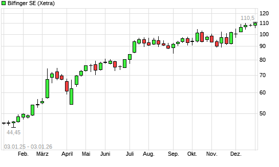 Mit dem Anstieg auf 110,70 EUR hat die Bilfinger-Aktie (ISIN DE0005909006) am 02.01.2026 ein neues All-Time-High erreicht und damit den Kurs vom 16.12.2025 eingestellt.