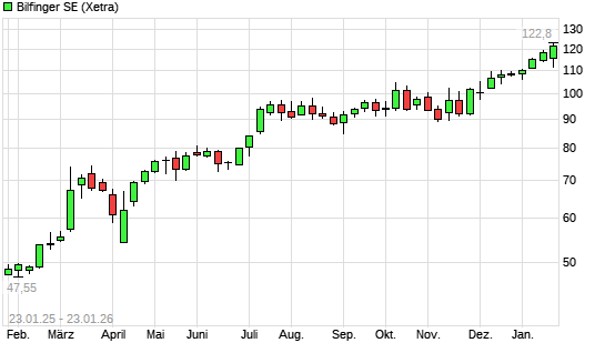 Mit dem Anstieg auf 121,60 EUR hat die Bilfinger-Aktie (ISIN DE0005909006) am 22.01.2026 ein neues All-Time-High erreicht und damit den Kurs vom 15.01.2026 eingestellt.