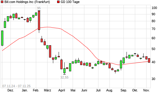 Mit dem Rücksetzer auf 40,66 EUR hat die Bill.com Holdings-Aktie am 06.11.2025 die 100-Tage-Linie nach unten gekreuzt.