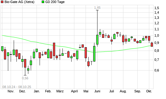 Mit dem Rücksetzer auf 0,82 EUR hat die Bio-Gate-Aktie am 07.10.2025 die 200-Tage-Linie nach unten gekreuzt.