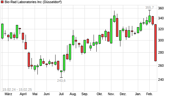 Mit dem Rücksetzer auf 276,80 EUR hat die Bio-Rad Laboratories-Aktie (ISIN US0905722072) am 14.02.2025 ein neues 6-Monats-Tief erreicht und damit den Kurs vom 23.08.2024 eingestellt.
