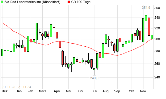 Mit dem Anstieg auf 300,90 EUR hat die Bio-Rad Laboratories-Aktie am 20.11.2024 die 100-Tage-Linie nach oben gekreuzt.