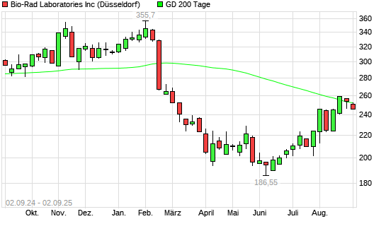 Mit dem Anstieg auf 251,90 EUR hat die Bio-Rad Laboratories-Aktie am 01.09.2025 die 200-Tage-Linie nach oben gekreuzt.