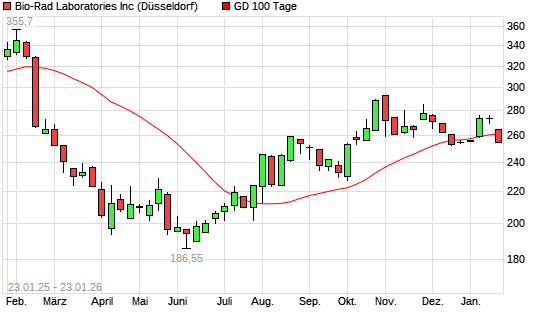Mit dem Rücksetzer auf 258,90 EUR hat die Bio-Rad Laboratories-Aktie am 22.01.2026 die 100-Tage-Linie nach unten gekreuzt.