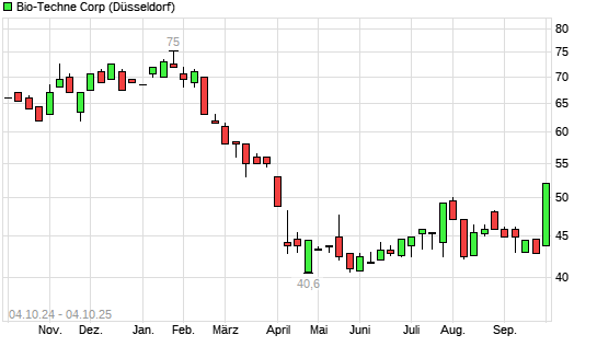 Mit dem Anstieg auf 53,50 EUR hat die Bio-Techne-Aktie (ISIN US09073M1045) am 03.10.2025 ein neues 6-Monats-Hoch erreicht und damit den Kurs vom 02.10.2025 eingestellt.