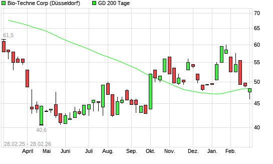 Mit dem Anstieg auf 49,20 EUR hat die Bio-Techne-Aktie am 27.02.2026 die 200-Tage-Linie nach oben gekreuzt.