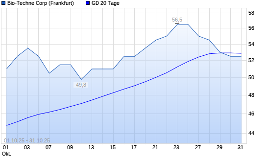 Mit dem Rücksetzer auf 52,50 EUR hat die Bio-Techne-Aktie am 30.10.2025 die 20-Tage-Linie nach unten gekreuzt.