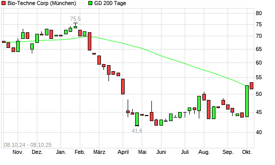 Mit dem Rücksetzer auf 50,50 EUR hat die Bio-Techne-Aktie am 07.10.2025 die 200-Tage-Linie nach unten gekreuzt.