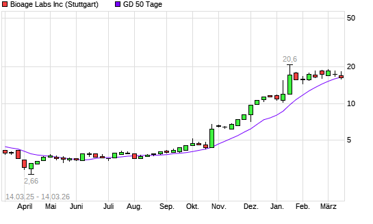 Mit dem Rücksetzer auf 16,00 EUR hat die BioAge Labs-Aktie am 13.03.2026 die 50-Tage-Linie nach unten gekreuzt.