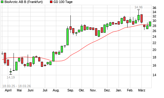 Mit dem Anstieg auf 28,68 EUR hat die BioArctic AB B-Aktie am 17.03.2026 die 100-Tage-Linie nach oben gekreuzt.