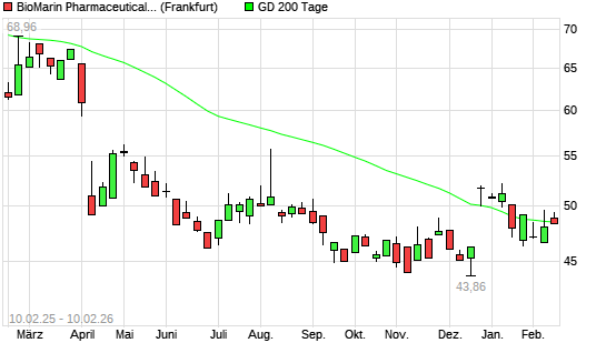 Mit dem Anstieg auf 49,33 EUR hat die BioMarin Pharmaceutical-Aktie am 09.02.2026 die 200-Tage-Linie nach oben gekreuzt.