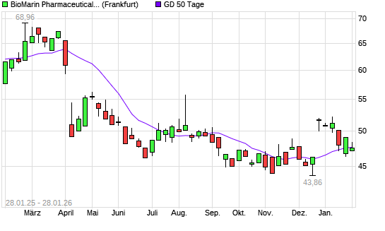 Mit dem Anstieg auf 48,39 EUR hat die BioMarin Pharmaceutical-Aktie am 27.01.2026 die 50-Tage-Linie nach oben gekreuzt.