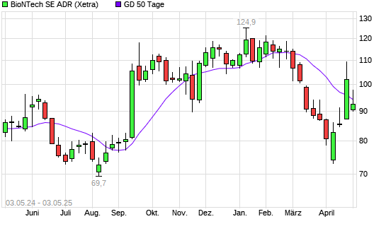 Mit dem Anstieg auf 94,05 EUR hat die BioNTech-Aktie am 02.05.2025 die 50-Tage-Linie nach oben gekreuzt.