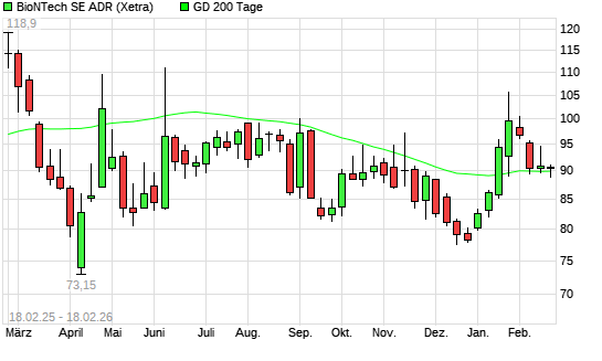 Mit dem Rücksetzer auf 88,55 EUR hat die BioNTech-Aktie am 17.02.2026 die 200-Tage-Linie nach unten gekreuzt.