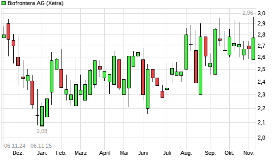 Mit dem Anstieg auf 2,84 EUR hat die Biofrontera-Aktie (ISIN DE000A4BGGM7) am 05.11.2025 ein neues 6-Monats-Hoch erreicht und damit den Kurs vom 20.08.2025 eingestellt.