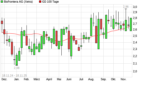 Mit dem Anstieg auf 2,63 EUR hat die Biofrontera-Aktie am 17.11.2025 die 100-Tage-Linie nach oben gekreuzt.