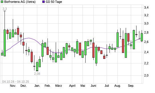 Mit dem Anstieg auf 2,74 EUR hat die Biofrontera-Aktie am 03.10.2025 die 50-Tage-Linie nach oben gekreuzt.