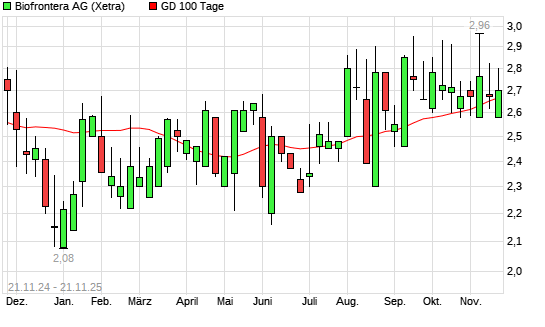Mit dem Rücksetzer auf 2,57 EUR hat die Biofrontera-Aktie am 20.11.2025 die 100-Tage-Linie nach unten gekreuzt.