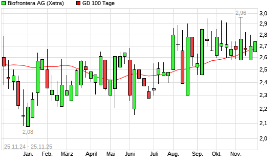 Mit dem Rücksetzer auf 2,57 EUR hat die Biofrontera-Aktie am 24.11.2025 die 100-Tage-Linie nach unten gekreuzt.