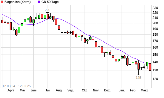Mit dem Rücksetzer auf 132,10 EUR hat die Biogen-Aktie am 11.03.2025 die 50-Tage-Linie nach unten gekreuzt.