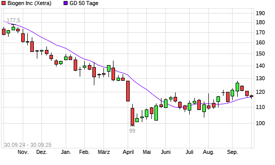 Mit dem Rücksetzer auf 114,90 EUR hat die Biogen-Aktie am 29.09.2025 die 50-Tage-Linie nach unten gekreuzt.