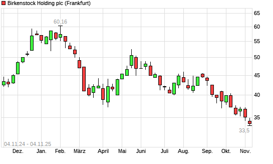 Mit dem Rücksetzer auf 33,50 EUR hat die Birkenstock Holding-Aktie (ISIN JE00BS44BN30) am 03.11.2025 ein neues All-Time-Low erreicht und damit den Kurs vom 13.10.2023 eingestellt.