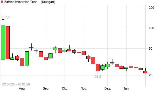 Mit dem Rücksetzer auf 22,20 EUR hat die BitMine Immersion Technologies-Aktie (ISIN US09175A2069) am 29.01.2026 ein neues All-Time-Low erreicht und damit den Kurs vom 20.11.2025 eingestellt.