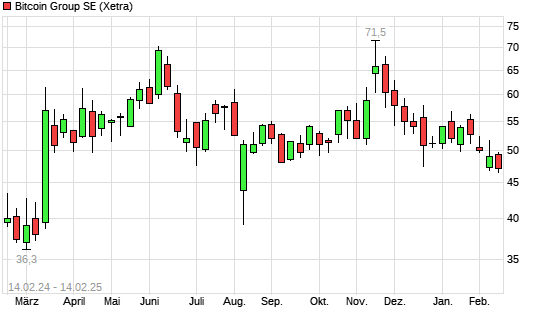 Mit dem Rücksetzer auf 47,70 EUR hat die Bitcoin Group-Aktie (ISIN DE000A1TNV91) am 13.02.2025 ein neues 6-Monats-Tief erreicht und damit den Kurs vom 06.09.2024 eingestellt.