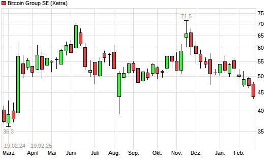Mit dem Rücksetzer auf 42,95 EUR hat die Bitcoin Group-Aktie (ISIN DE000A1TNV91) am 18.02.2025 ein neues 6-Monats-Tief erreicht und damit den Kurs vom 17.02.2025 eingestellt.