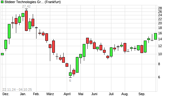 Mit dem Anstieg auf 16,00 EUR hat die Bitdeer Technologies Group-Aktie (ISIN KYG114481008) am 03.10.2025 ein neues 6-Monats-Hoch erreicht und damit den Kurs vom 01.10.2025 eingestellt.