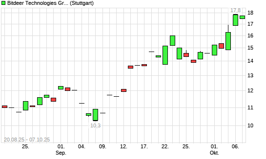 Mit dem Anstieg auf 17,90 EUR hat die Bitdeer Technologies Group-Aktie (ISIN KYG114481008) am 06.10.2025 ein neues 6-Monats-Hoch erreicht und damit den Kurs vom 03.10.2025 eingestellt.