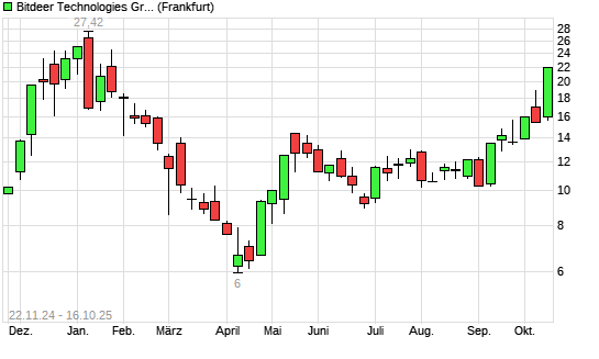 Mit dem Anstieg auf 22,00 EUR hat die Bitdeer Technologies Group-Aktie (ISIN KYG114481008) am 15.10.2025 ein neues 6-Monats-Hoch erreicht und damit den Kurs vom 07.10.2025 eingestellt.