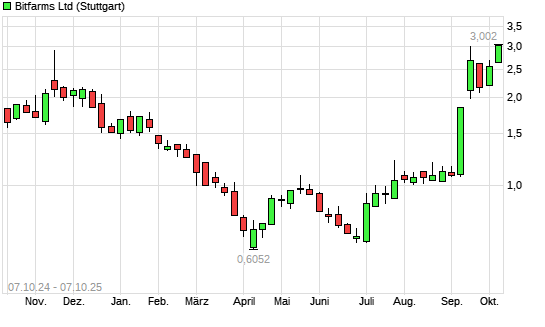 Mit dem Anstieg auf 2,94 EUR hat die Bitfarms-Aktie (ISIN CA09173B1076) am 06.10.2025 ein neues 12-Monats-Hoch erreicht und damit den Kurs vom 18.09.2025 eingestellt.