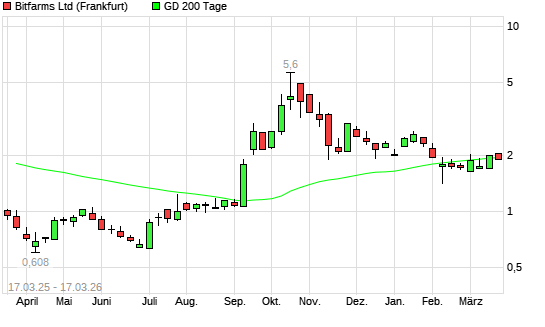 Mit dem Rücksetzer auf 1,97 EUR hat die Bitfarms-Aktie am 16.03.2026 die 200-Tage-Linie nach unten gekreuzt.