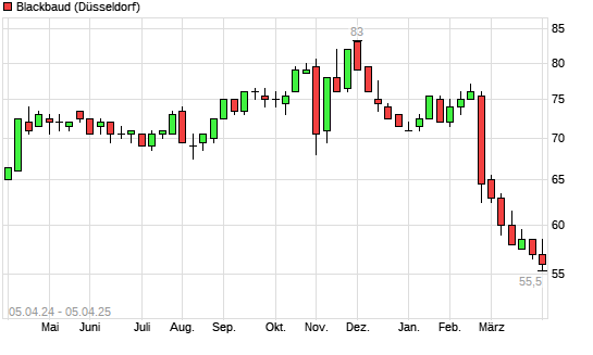 Mit dem Rücksetzer auf 56,00 EUR hat die Blackbaud-Aktie (ISIN US09227Q1004) am 04.04.2025 ein neues 12-Monats-Tief erreicht und damit den Kurs vom 03.04.2025 eingestellt.