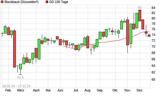 Mit dem Rücksetzer auf 74,50 EUR hat die Blackbaud-Aktie am 16.12.2024 die 100-Tage-Linie nach unten gekreuzt.