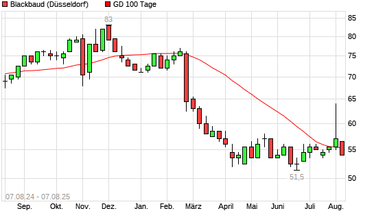 Mit dem Rücksetzer auf 54,00 EUR hat die Blackbaud-Aktie am 06.08.2025 die 100-Tage-Linie nach unten gekreuzt.