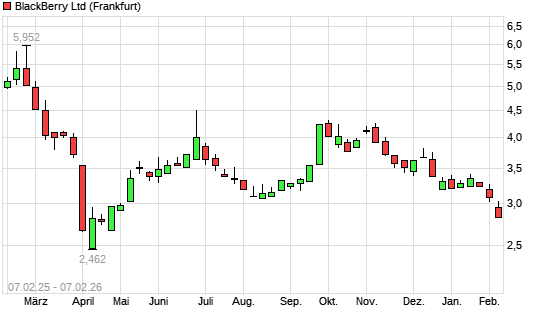 Mit dem Rücksetzer auf 2,82 EUR hat die Blackberry-Aktie (ISIN CA09228F1036) am 06.02.2026 ein neues 6-Monats-Tief erreicht und damit den Kurs vom 04.02.2026 eingestellt.