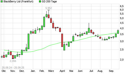 Mit dem Anstieg auf 3,75 EUR hat die Blackberry-Aktie am 24.09.2025 die 200-Tage-Linie nach oben gekreuzt.
